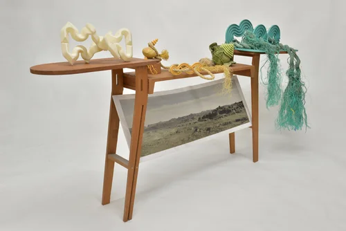 Wood, Rope, 3D Printed Elements, Found Ocean Fishing Line and Netting